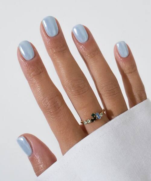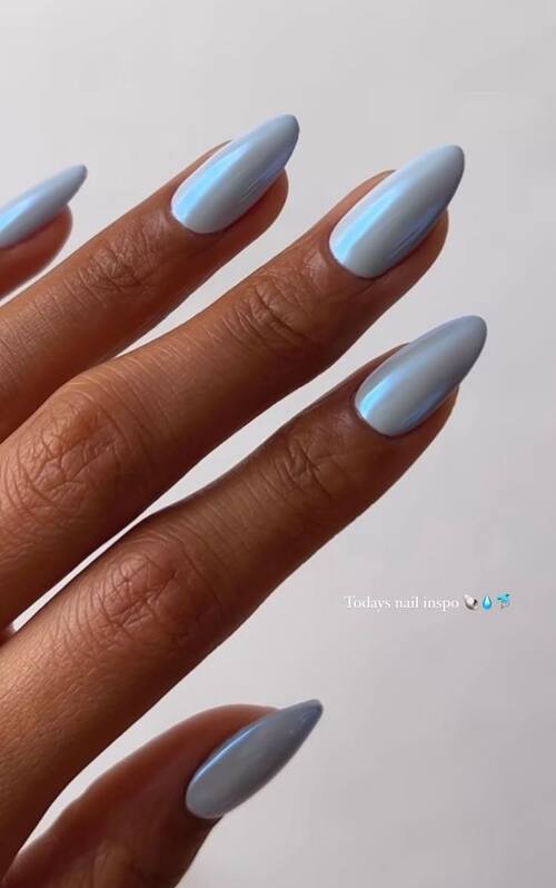 Pastel blue nails with fine shimmer create a frosty, dreamy vibe reminiscent of frozen lakes and winter skies.